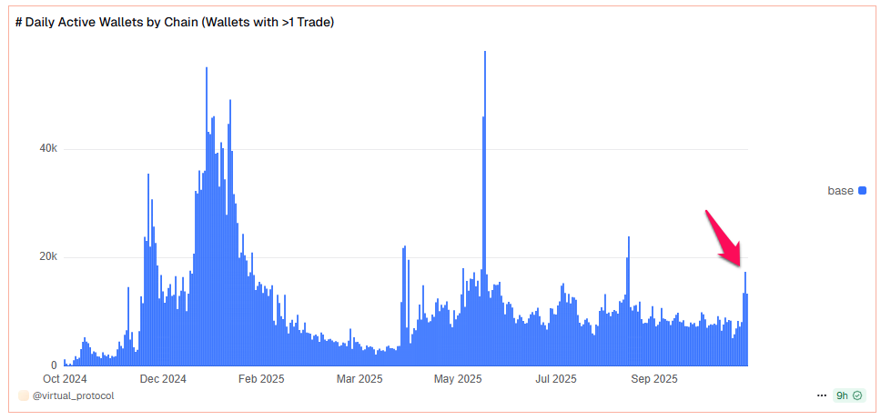 本周这个AI智能体生态迎来Coinbase Retail DEX等多项集成,a16z关于AI代理潜力的研报叠加x402代币热潮(该协议是AI代理代币主要启动平台),推动VIRTUAL日活地址十月翻倍至1.7万。