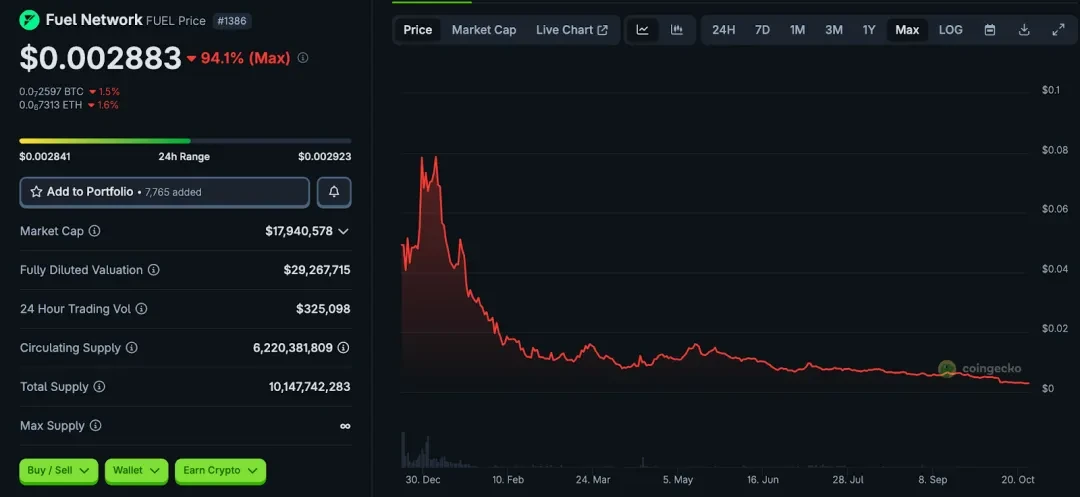 然而,在代币表现与生态落地上,Fuel Network 并未兑现预期。FUEL 当前价格约为 0.003 美元,市值仅千万美元,高点下跌超94%。以太坊扩容、各种 L2、模块化链方案层出不穷,Fuel 的差异化优势能否长期维系尚存疑问。