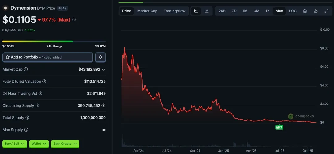 项目启动于 2022 年,2024 年年初上线代币 DYM。尽管技术定位明确、背后获得Big Brain Holdings、Stratos、Cogitent Ventures等多家投资机构支持,但从市场表现来看,DYM 当前价格已较峰值下跌逾 97% 以上。据数据显示,其历史高点接近约 $8.50,现价处于约 $0.10 美元区间。项目当前虽仍在运行,但生态化进展缓慢,社区与用户参与度未达到预期。