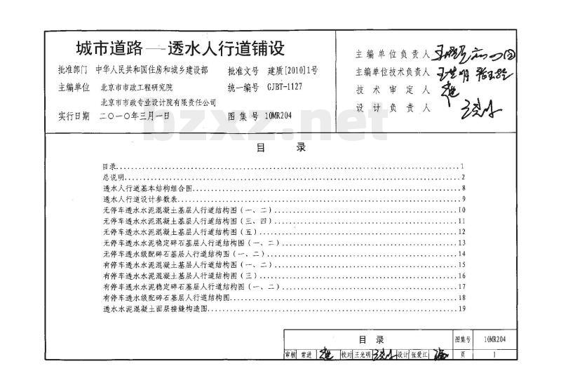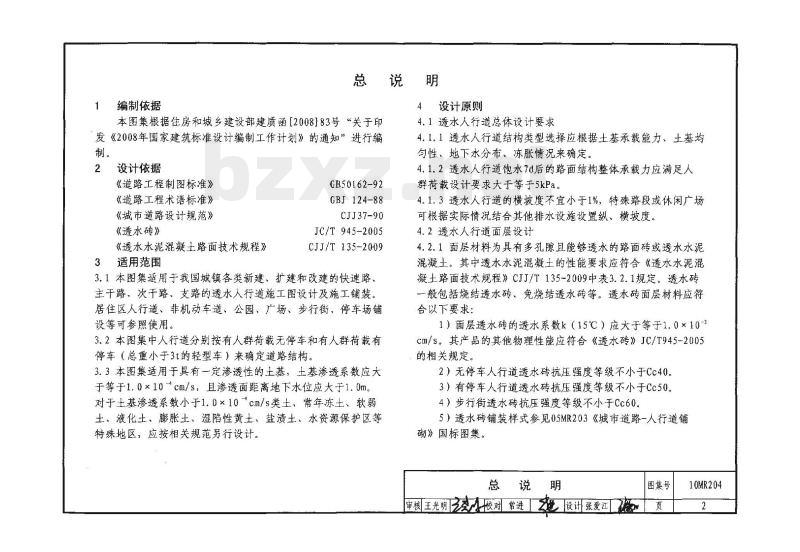 《透水水泥混凝土路面技术规程》CJJ/T135-2009自2010年7月1日起施行,为贯彻新规程的实施执行,特编制出版10MR204《城市道路-透水人行道铺设》国标图集。本图集适用于我国城镇各类新建、扩建和改建的快速路、主干路,次干路、支路的透水人行道施工图设计及施工铺装。居住区人行道、非机动车道,公园、广场、步行街、停车场铺设等可参照使用。 内容包括按有人群荷载无停车和有人群荷载有停车(总重小于3吨的轻型车)两种工况分别给出透水水泥混凝土基层、透水水泥稳定碎石基层、透水级配碎石基层的透水人行道结构,及其相关设计与施工要求。 本图集通过阐述透水人行道基本结构组合,和路面结构层的功能作用、设计参数选取,以及透水材料的选用,对透水人行道的施工图设计及现场施工提出技术要求,以求促进环保生态铺设技术的工程应用。