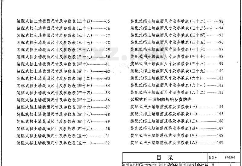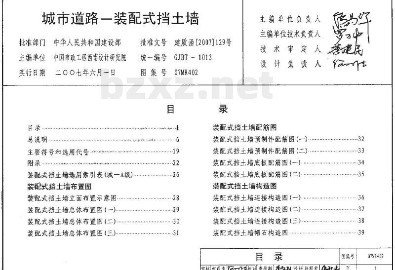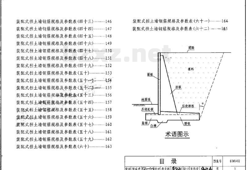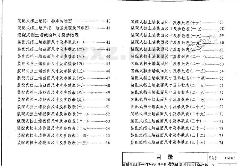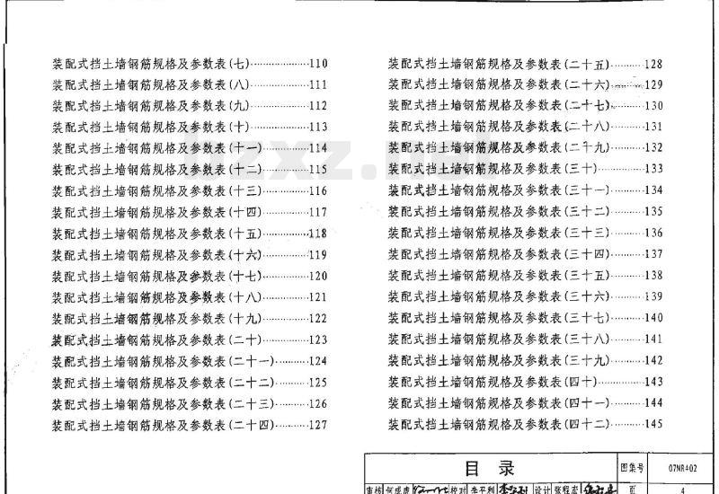 07MR402《城市道路-装配式挡土墙》国家标准设计图集适用于地震动峰值加速度不大于0.20g地区城镇各类新建、扩建和改建的快速路、主干路、次干路及支路的装配式钢筋混凝土扶壁式路肩挡土墙施工图设计。 本图集主要依据《公路路基设计规范》JTG D30-2004、《公路交通安全设施设计规范》JTG D81-2006、《公路桥涵地基与基础设计规范》JTG D63-2007等规范,按照碰撞荷载、地基承载力、基底摩擦系数、墙背填料内摩擦角及填料重度等设计参数编制成墙高为2~7m的装配式挡土墙的布置图、配筋图、构造图、截面尺寸及参数表、钢筋规格及参数表等图表供使用者方便选用。