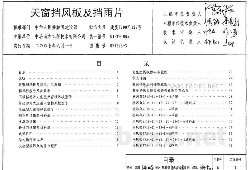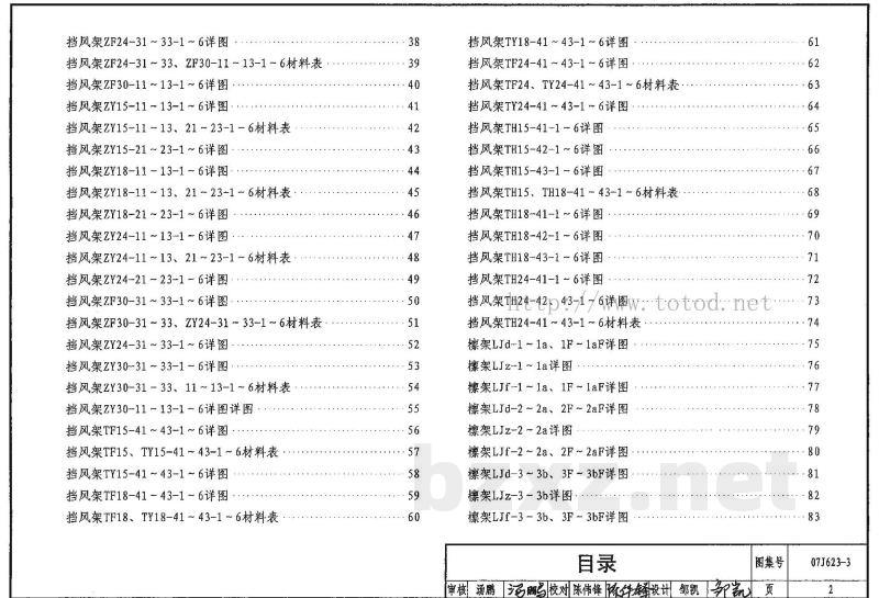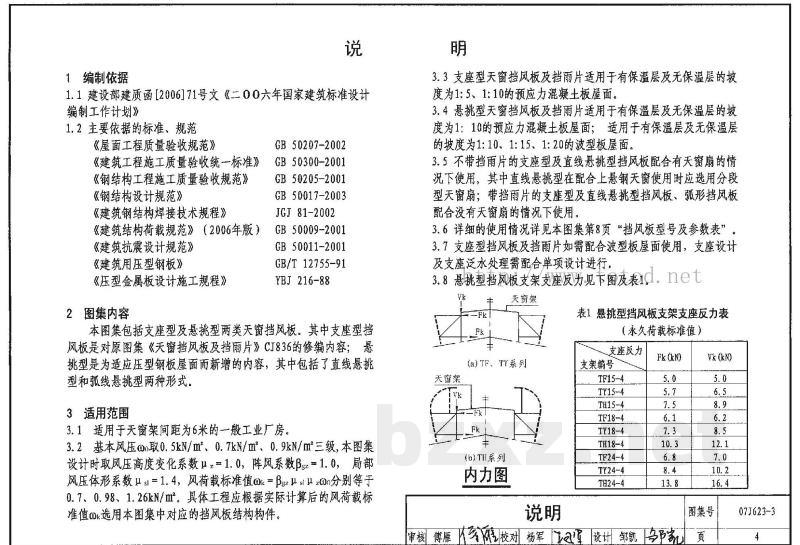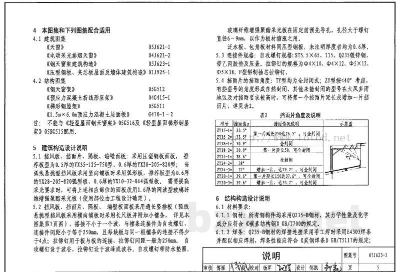 07J623-3《天窗挡风板及挡雨片》国家建筑标准设计图集适用于天窗架间距为6米的一般工业厂房。 图集编制了天窗洞口高度1.5米、1.8米、2.4米、3.0米支座型天窗挡风板及挡雨片;天窗洞口高度1.5米、1.8米、2.4米悬挑型天窗挡风板及挡雨片。 本图集支座型天窗挡风板及挡雨片是与国家建筑标准设计图集05G511《梯形钢屋架》、05G512《钢天窗架》、04G415-1《预应力混凝土折线形屋架》配合使用的图集,适用于预应力混凝土面板屋面;悬挑型天窗挡风板及挡雨片适用于彩色涂层压型钢板屋面。 天窗挡风板面板为彩色涂层压型钢板,挡雨片除采用彩色涂层压型钢板外,为增加天窗采光性能还有玻璃钢挡雨片供设计选择。天窗挡风板及挡雨片构造简单,施工方便。 图集按施工图设计深度编制,施工图设计可直接选用,施工单位可按图加工制作、安装。