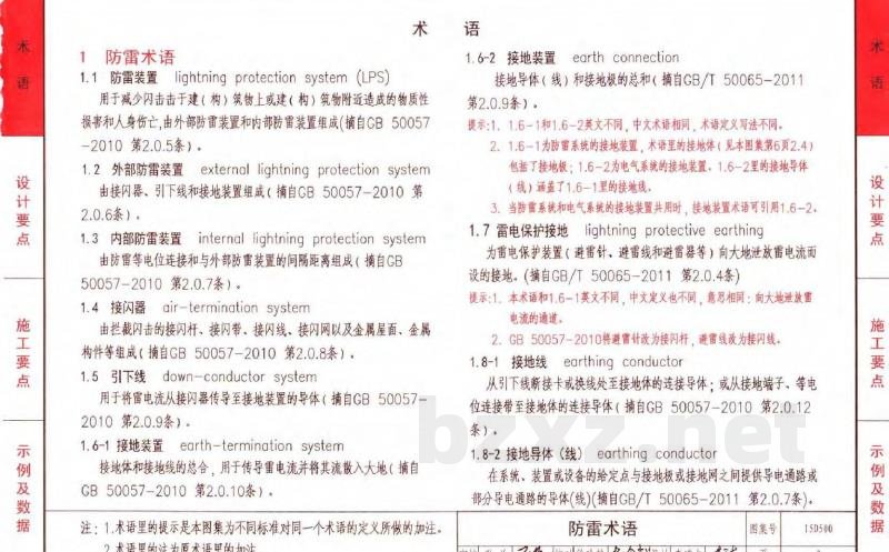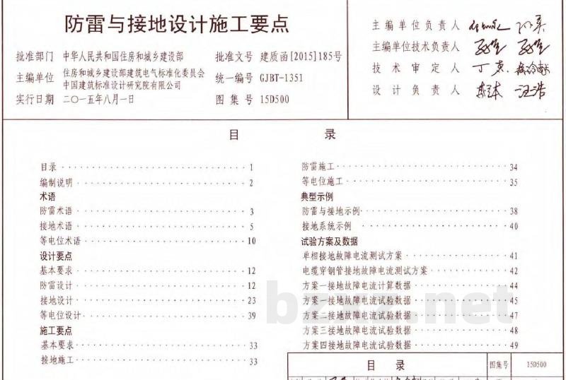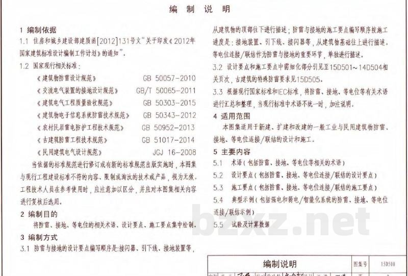 本合订本包括: 15D500《防雷与接地设计施工要点》图集适用于新建、改建和扩建的民用与一般工业建筑物防雷、接地、等电位的设计与施工。图集将D500系列的防雷、接地、等电位等有关术语根据现行国家标准和IEC标准,进行汇总、整理。将一般工业与民用建筑物防雷、接地、等电位连接/联结的设计与施工要点集中汇编,还包括典型示例和相关试验数据。本图集根据防雷与接地设计、施工流程编写设计和施工中的要点。可指导防雷与接地电气工程的设计、施工、监理和验收。 15D501《建筑物防雷设施安装》图集适用于新建、扩建和改建的建、构筑物的防雷设施的设计与安装。内容包括建筑物的接闪杆、接闪带、防雷引下线等防雷装置的安装,独立接闪杆(线)塔的安装和电涌保护器安装三部分。本图集依据《建筑物防雷设计规范》GB 50057和《建筑物电子信息系统防雷技术规范》GB 50343等现行国家标准的有关规定进行修编,按现行规范的要求更新了接闪杆、接闪带等防雷设施的安装方法,并补充了一些新材料、新技术的内容。本图集可供设计和施工人员在工程中根据实际情况直接选用。 15D502《等电位联结安装》图集适用于一般工业与民用建筑物电气装置防间接接触电击和防电磁干扰的等电位联结安装。图集依据现行《建筑物防雷设计规范》GB 50057和《低压配电设计规范》GB 50054,更新和汇编了工程中经常遇到的各种场所和设施的等电位联结安装的做法和和电子信息设备防电磁干扰的等电位联结安装做法。增加了电梯井道和室外电动伸缩门等的等电位联结安装做法,图集可供设计和施工人员在工程中直接选用。