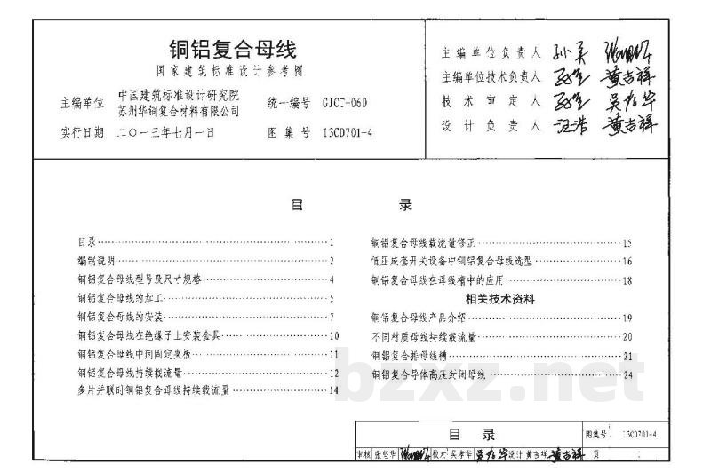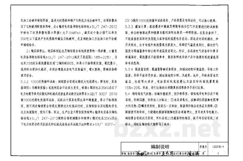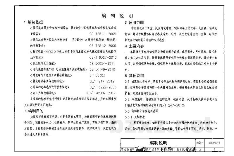 13CD701-4《铜铝复合母线》根据国家现行有关标准,并结合实际需要,对铜铝复合母线的设计选型和施工安装进行介绍,供设计和施工人员参考使用。本图集适用于工业、民用建筑中高、低压成套开关设备、变压器、箱式变电站、封闭母线槽等配电设备及冶炼、轧制、风力发电等变流、变频、电气控制设备中铜铝复合母线的应用选型。图集主要内容包括铜铝复合母线的技术参数、加工方法及安装、持续载流量及铜铝复合母线在低压开关柜、母线槽中的应用等相关技术资料。本图集给出了铜铝复合母线在使用中常用的数据、施工方法和注意事项,方便设计和施工人员选用。